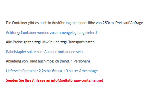 Können Sie Lagercontainer nur benutzen, für den Fall, dass es in einem Sondermaß hergestellt ist? In diesem Fall können wir Ihnen von Nutzen sein. Als kompetente und professionelle Lagercontainer Verkäufer & Anbieter produzieren wir unsre Lagerplätze nach Maß an. Zu einem besonders erfolgreichen Preis- / Leistungsgefüge – so offerieren wir Ihnen die Lagerplätze auf Traum, obwohl es Spezialanfertigungen sind.